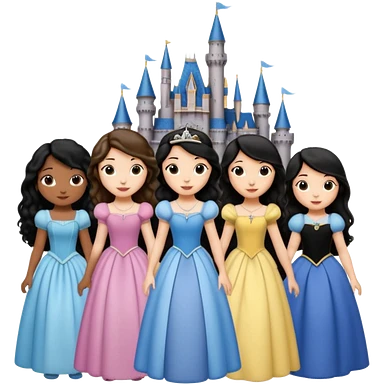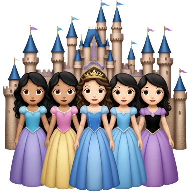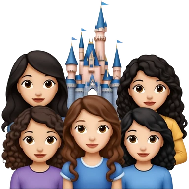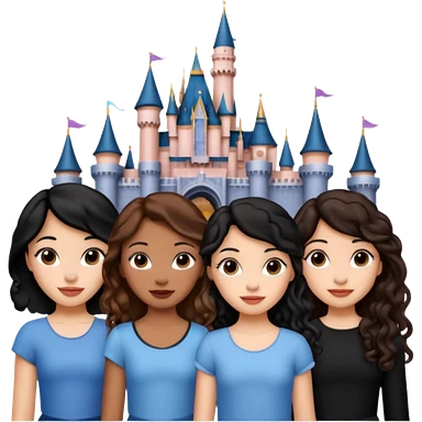 Quiero que crees una imagen donde este el castillo de Disney y por detrás o delante pon a quatro chicas: una con el pelo largo rizado marrón , otra con el pelo corto negro, otra con el pelo mediano liso marrón y otra con el pelo negro largo liso emoji