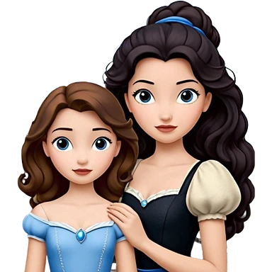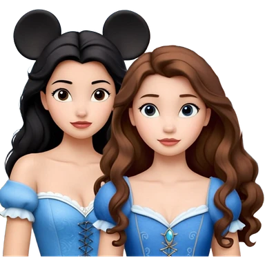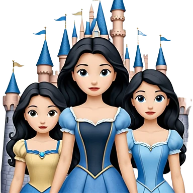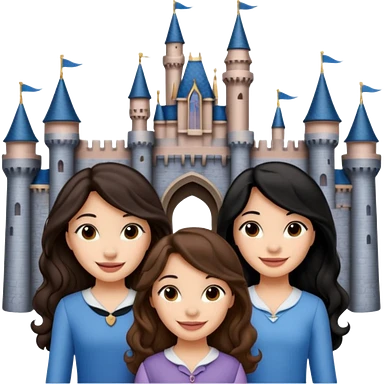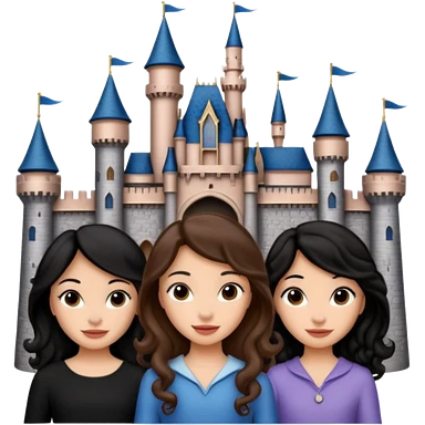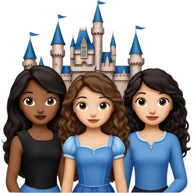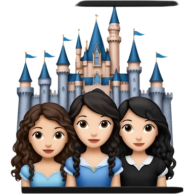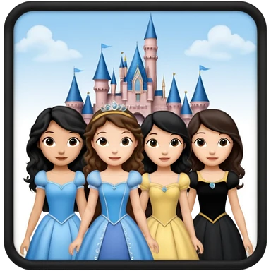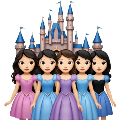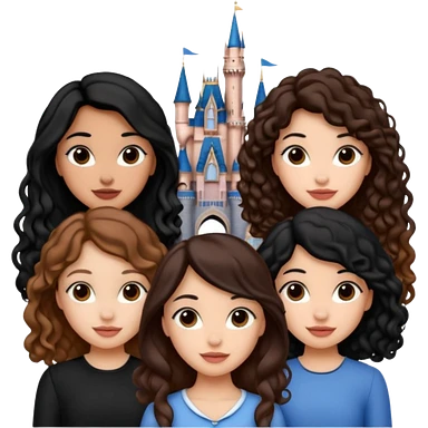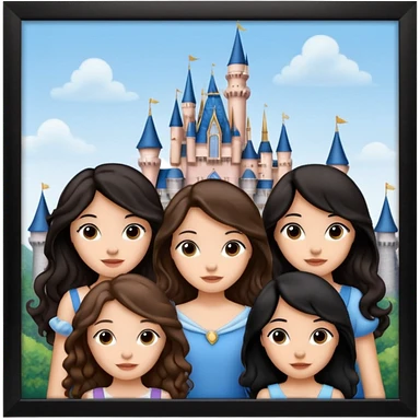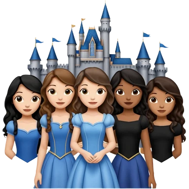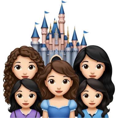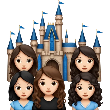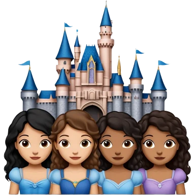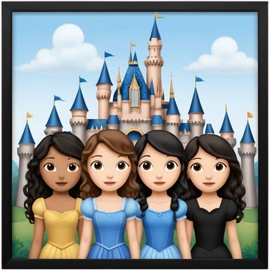 Quiero que crees una imagen donde este el castillo de Disney y por detrás o delante pon a 4 chicas: una con el pelo largo rizado marrón , otra con el pelo muy corto negro, como un chico, otra con el pelo mediano liso marrón con ojos azulesy otra con el pelo negro largo liso . Todos son color carne emoji