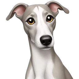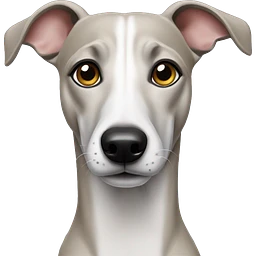 a beige whippet with a dark snout, black and white mouth patchy and black angel wing like eyes emoji