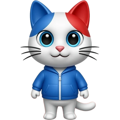 white skin emoji cat, blue left ear ,red right ear ,wear a blue jacket, red parket emoji