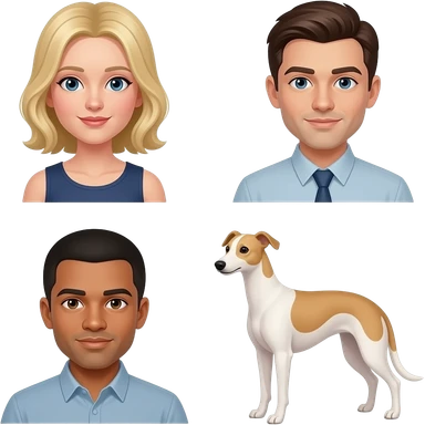 White girl with blonde hair to jer chin, a white man with short dark hair and a beddlington whippet blonde dogwith emoji