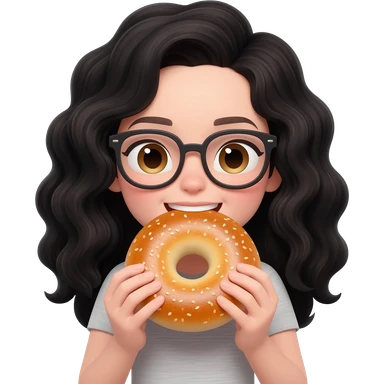 white girl, black wavy hair, glasses, eat bagel emoji