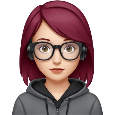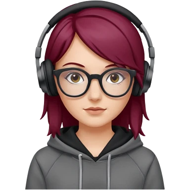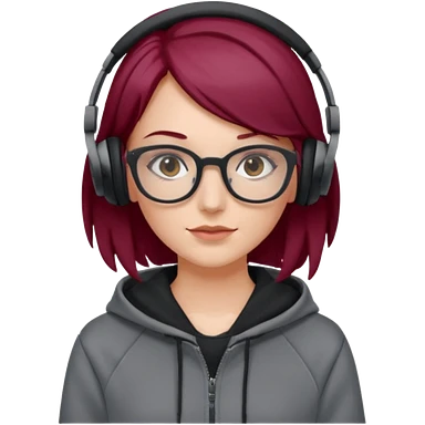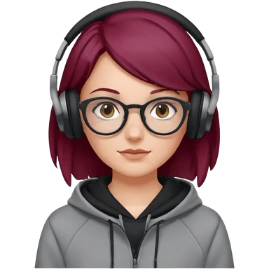 white girl with burgundy hair, gray square glasses, black deportive hoodie and black headphones emoji