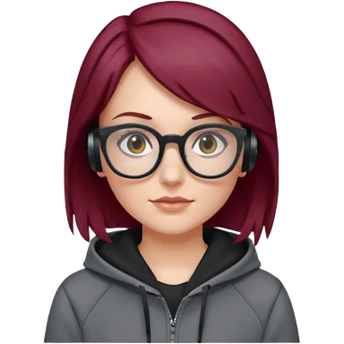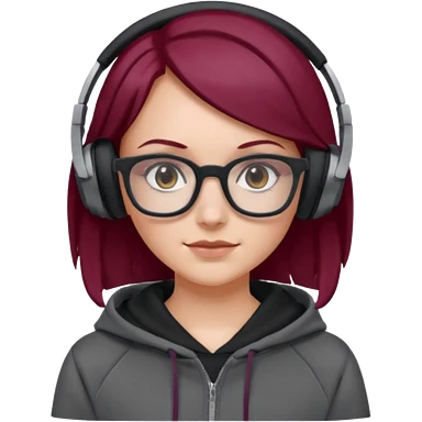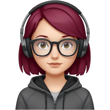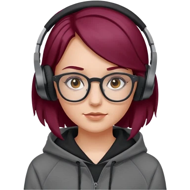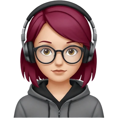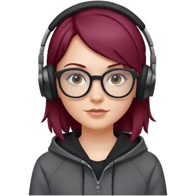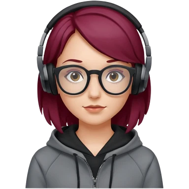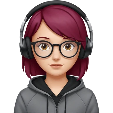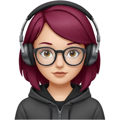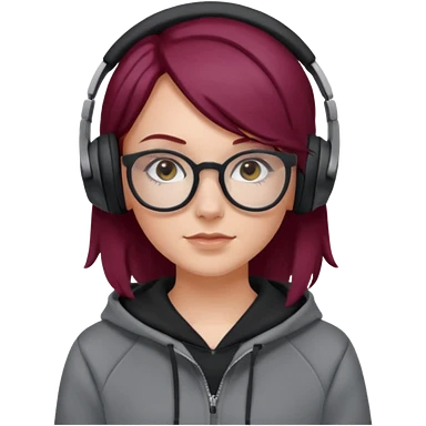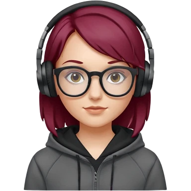 white girl with burgundy hair, gray rectangle glasses, black deportive hoodie and black headphones emoji