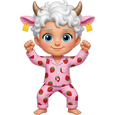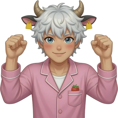 white-haired curly anime guy with long white eylashes with cow horns and pink cow ears with yellow tags in both cow ears poses in caramel dance pose with his fists up to his head with red blush on his cheeks in pink pajamas with strawberries emoji