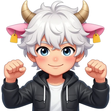 white-haired curly anime guy with long white eylashes with cow horns and pink cow ears with yellow tags in both cow ears poses in caramel dance pose with his fists up to his head with red blush on his cheeks emoji