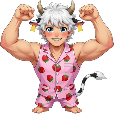 white-haired curly anime buff manly guy with long white eylashes with cow horns and cow ears with cow tail with yellow tags in both cow ears poses in caramel dance pose with his fists up to his head with red blush on his cheeks in pink pajamas with strawberries emoji