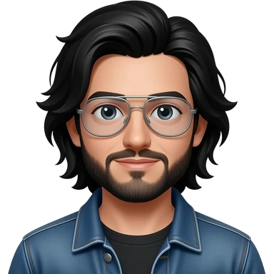 white male black past shoulder length hair, aviator glasses with clear lines, medium black beard in jean jacket with brown eyes emoji