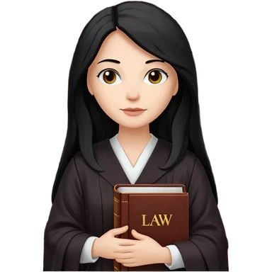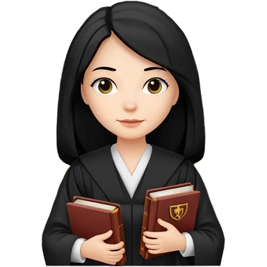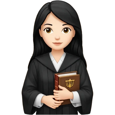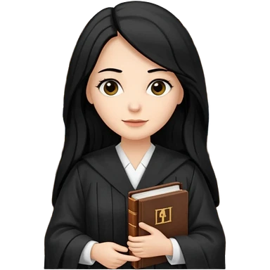white-women-with-long-black -hair-lawyer-in-lawyer’s-robe. Have law book in hand with bookshelf full of law books in the background. emoji