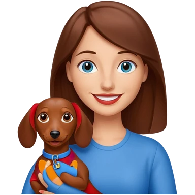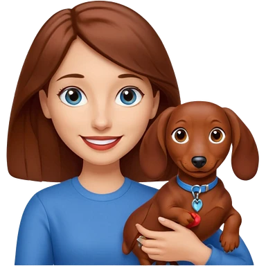 White woman with medium length brown hair and blue eyes holding a red dashound emoji