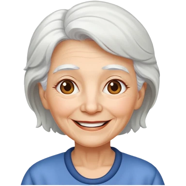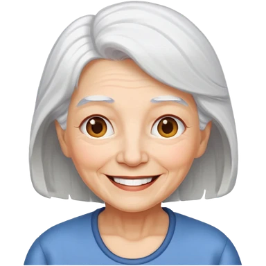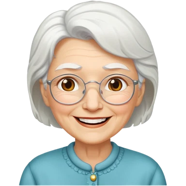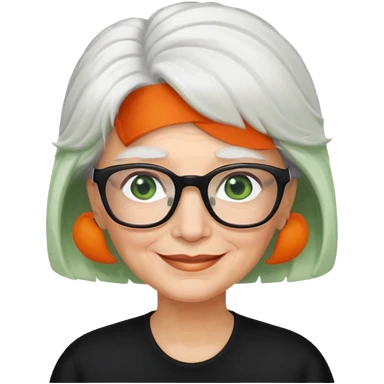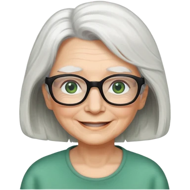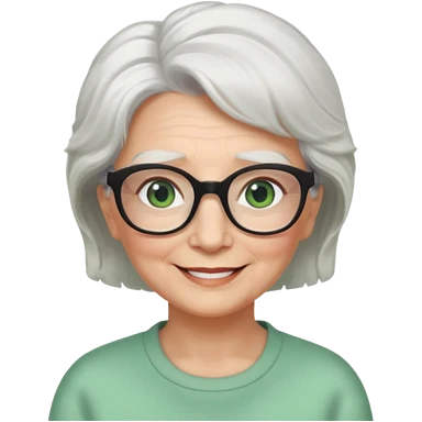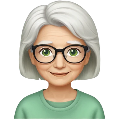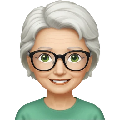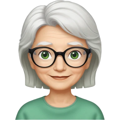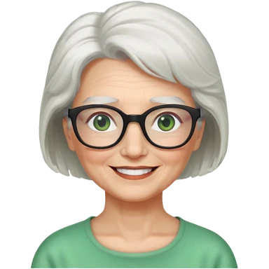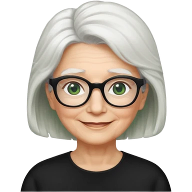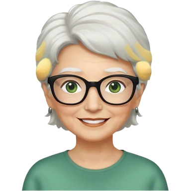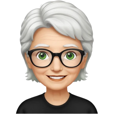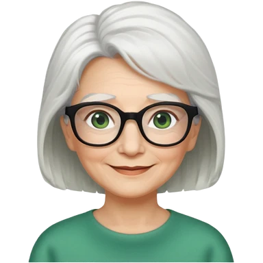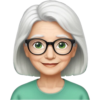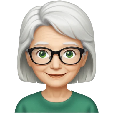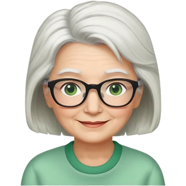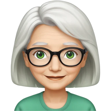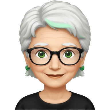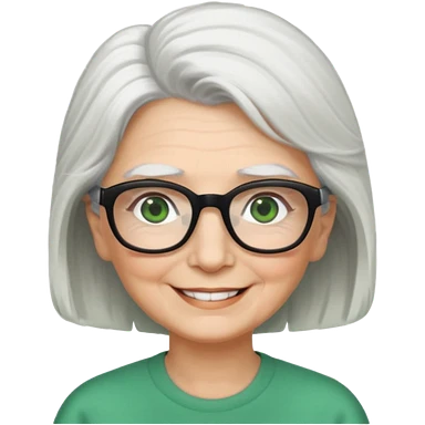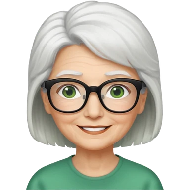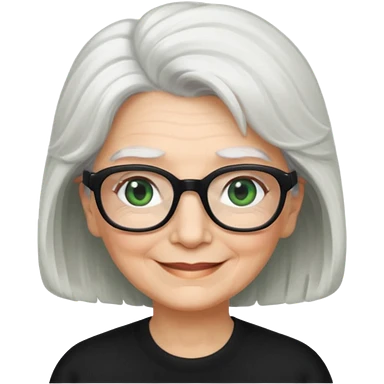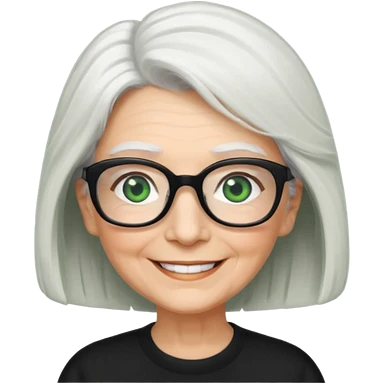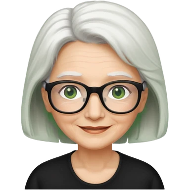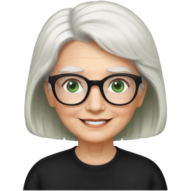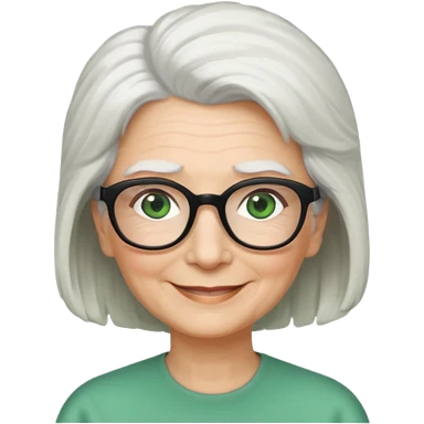 White hair grandma, green eyes, hair to shoulder, lokeg black glasses, rectangles face, smile , emoji