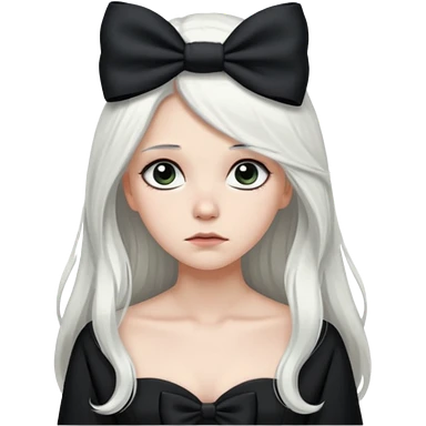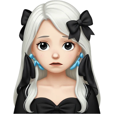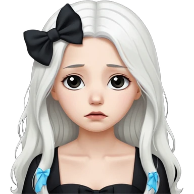 white long hair girl with black bow on her hair wearing black gown with a sad face emoji