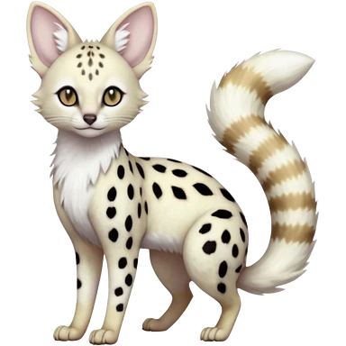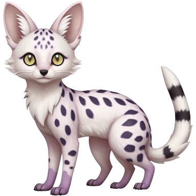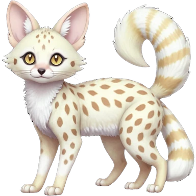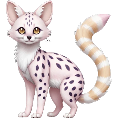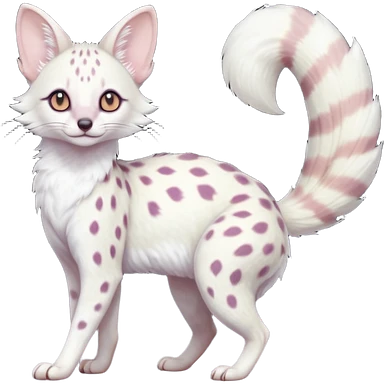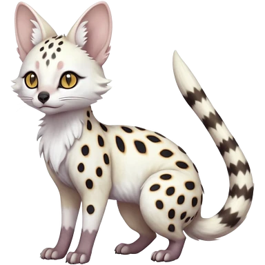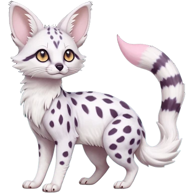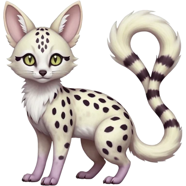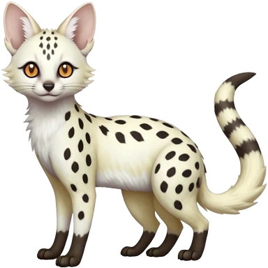White Albino grey-spotted Serval-Civet-Genet-Trico-Furret-Linoone-Fakémon-Pokémon-animal-hybrid-fusion-creature (full body) with vibrant glowing eyes, cute, elegant, soft, realistic, pastel fur emoji