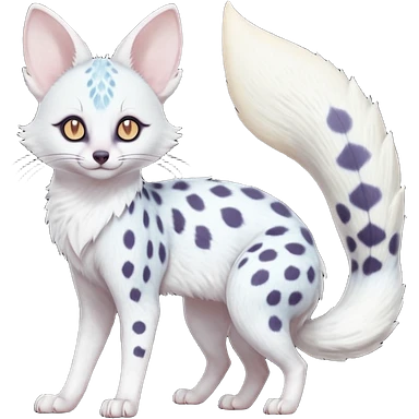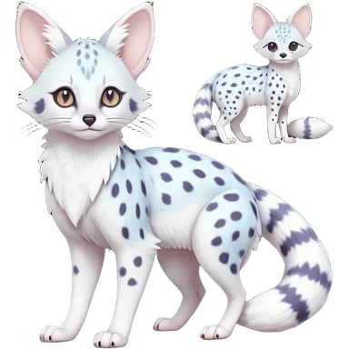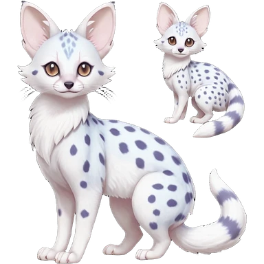 White Albino frosty snow-white whitish pastel-grey-spotted Serval-Civet-Genet-Trico-Furret-Linoone-Noibat-Espeon-Fakémon-Pokémon-animal-hybrid-fusion-creature (full body) with vibrant glowing eyes, cute, elegant, soft, realistic, pastel fur emoji