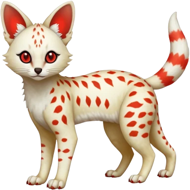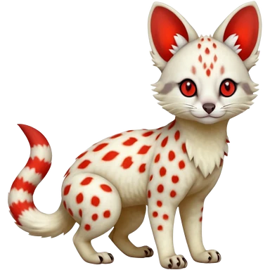 White Albino light spotted Serval-Civet-Genet-Trico-Furret-Linoone-Fakémon-Pokémon-animal-hybrid-fusion-creature (full body) with glowing red eyes, cute, elegant, soft, realistic, pastel fur emoji