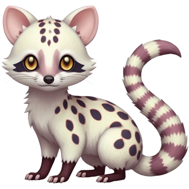White Albino grey-spotted Civet-Genet-Trico-Furret-Linoone-Fakémon-Pokémon-animal-hybrid-fusion-creature (full body) with vibrant glowing eyes, cute, elegant, soft, realistic, pastel fur emoji