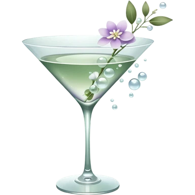 Minimalist spring aesthetic in muted sage green palette, elegant martini glass centerpiece, soft sunlight, floating bubbles, dainty white and lilac flowers, fresh leaves, glossy clean textures, modern iOS 18 style, soft gradients, airy negative space, ultra clean, calming pastel tones, 4k emoji