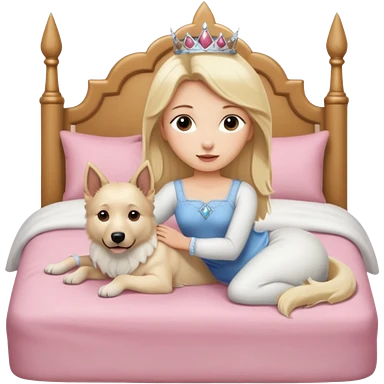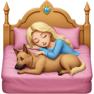 White Belgian shepherd dog with Brown eyes sleeping On a Princessbed with a blonde lady with blonde hair emoji