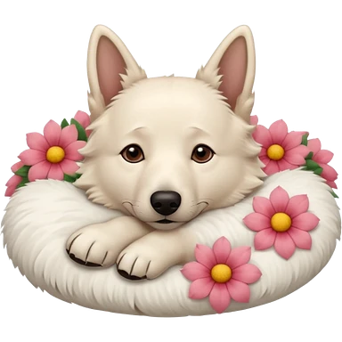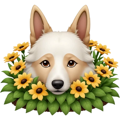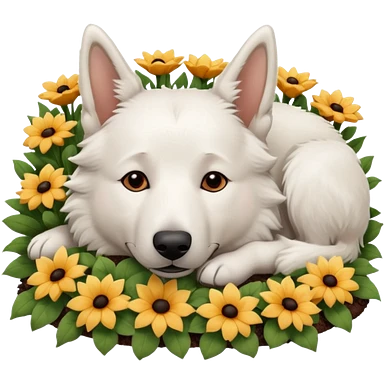 White Belgian shepherd dog with Brown eyes sleeping On a flowerbed emoji
