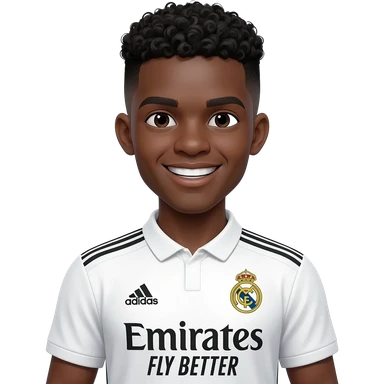 Smiling dark-skin footballer emoji with short black curly high-fade hair, big white-teeth grin, wearing a white Real Madrid jersey with black Adidas shoulder stripes, ‘Emirates Fly Better’ text on chest, small gold badge and Adidas logo.” emoji