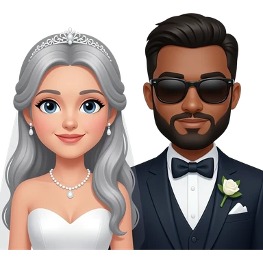 Pale skinned, grey haired bride and a white skinned, black haired, bearded groom with sunglasses on and a bowtie emoji