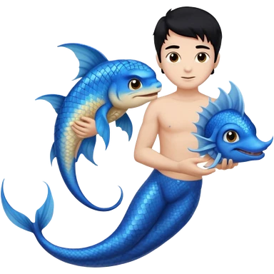 boy, black hair, brown eyes, white skin, Triton, with Triton in hand, blue Triton tail and blue triton fish ears emoji