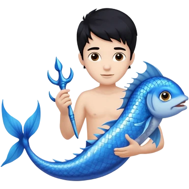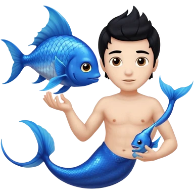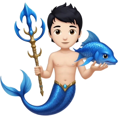 boy, black hair, brown eyes, white skin, Triton, with Triton in hand, blue Triton tail and blue triton ears emoji