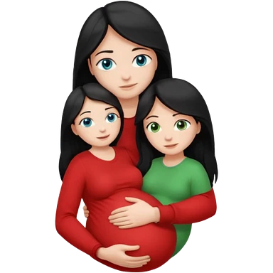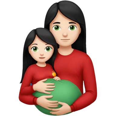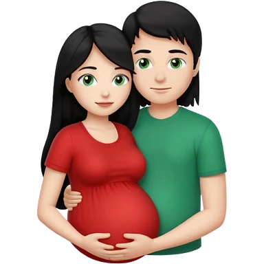 Make a couple emoji they are 18. The girl has long black hair and blue eyes and is hugging a pregnant boy with light brown hair and green eyes they are both wearing red top. They are both white emoji