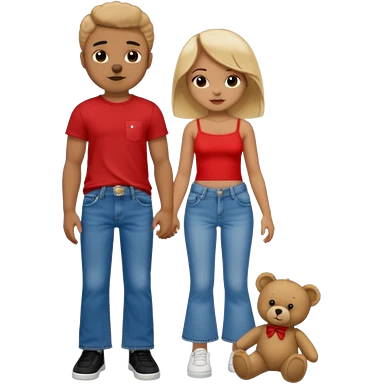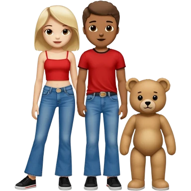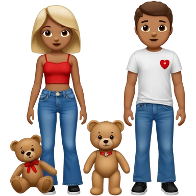 A boy and a girl teddy bear for the boy bear put on true religion shirt and jeans with black shoes and for the girl put flare jeans and a red tube top and white shoes just bears not the humans emoji