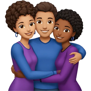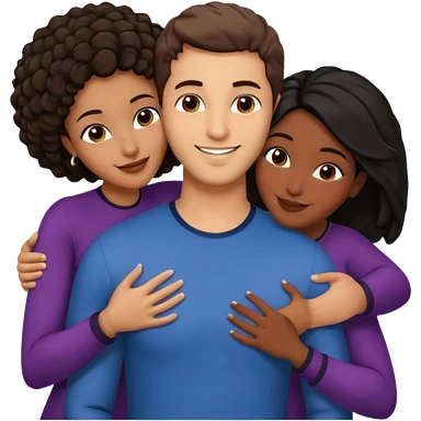middle Eastern man with short brown hairwith two black african women both are African one is medium tone light tone skin black and one is medium tone black with african hair styles. and they are all smiling and putting their arms around each other and kiss, kissing and hugging. emoji