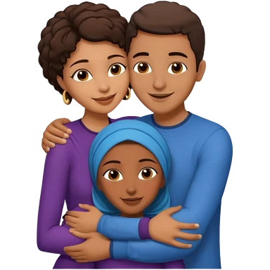 middle Eastern man with short brown hairwith two black african women both are African one is medium tone skin black and one is medium tone black with african hair styles. and they are all smiling and putting their arms around each other and kissing and hugging. emoji