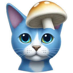 Blue smurf cat face with black eyes wearing a large white mushroom on his head emoji