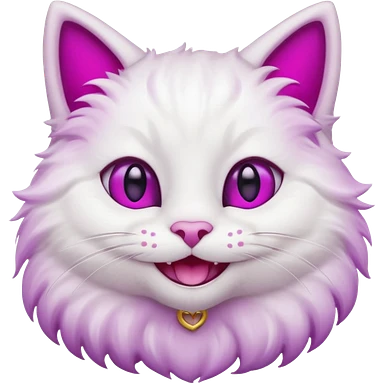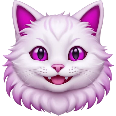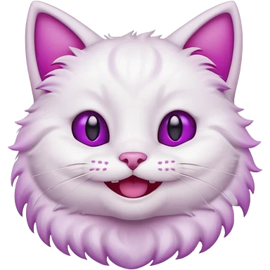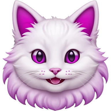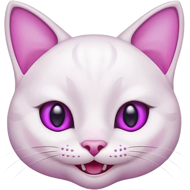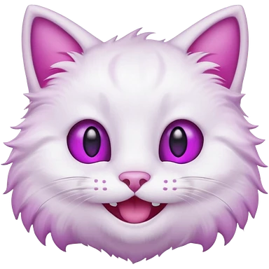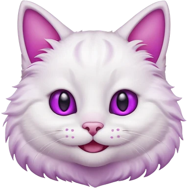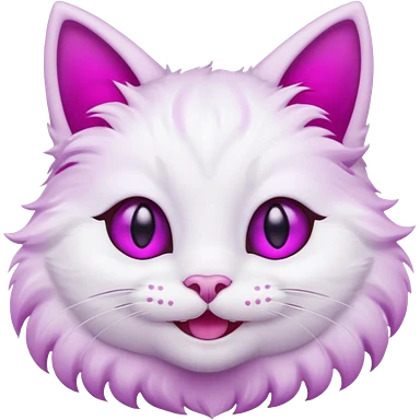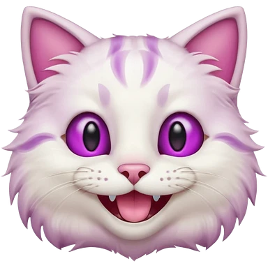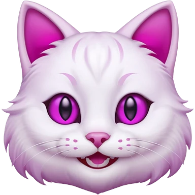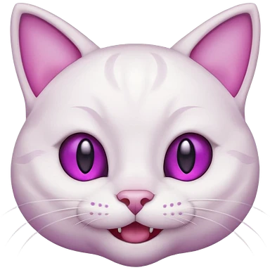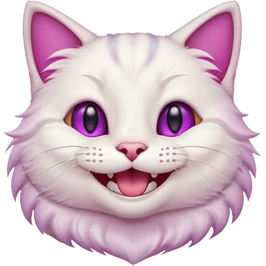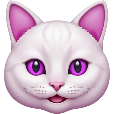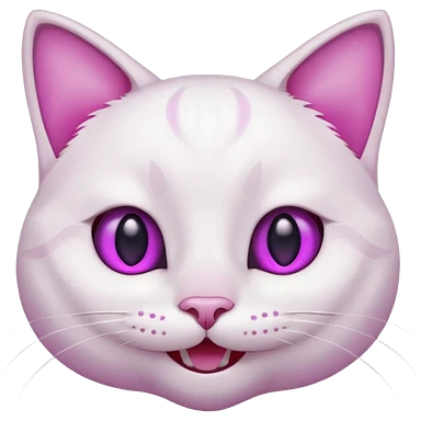 White cat smiling with teeth showing, pink inner ears, magenta purple eyes emoji