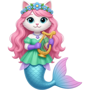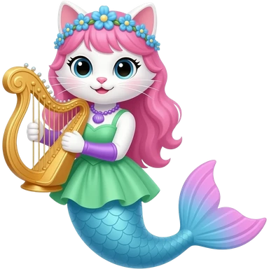 white cat with pink hair blue flower crown with light purple shell necklace green dress attached to light blue mermaid tail with pink fins purple gloves holding a golden harp artistic creation, beautiful art emoji