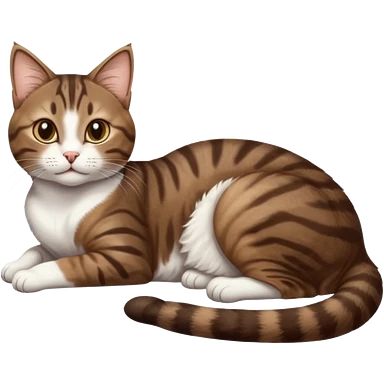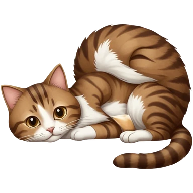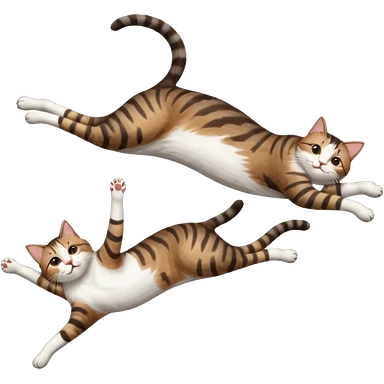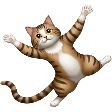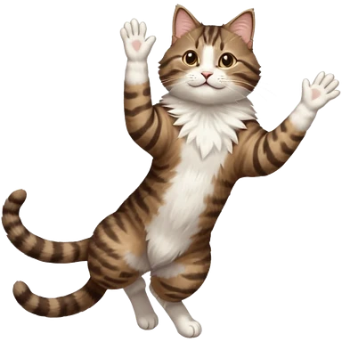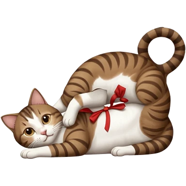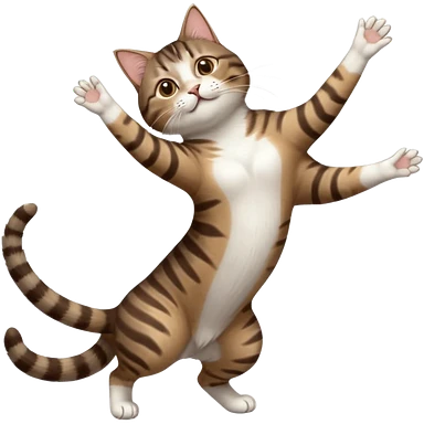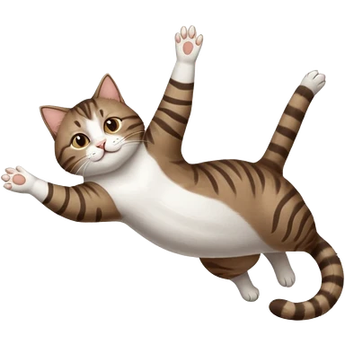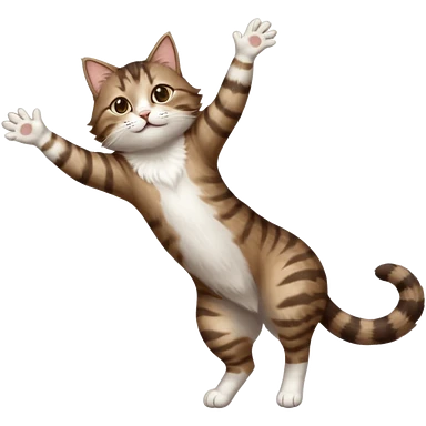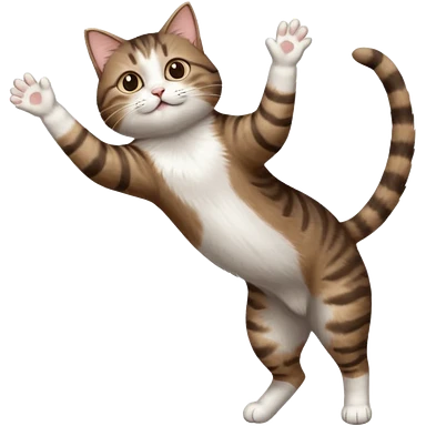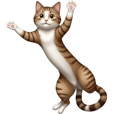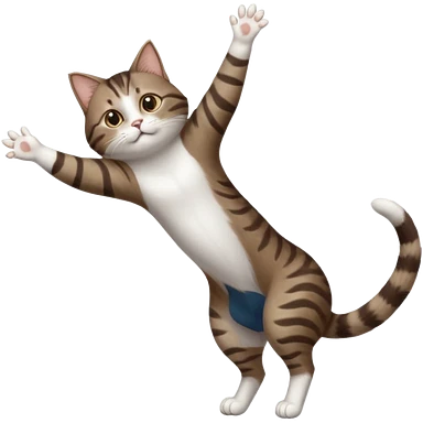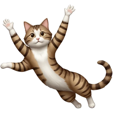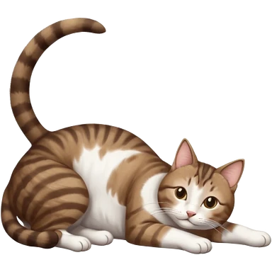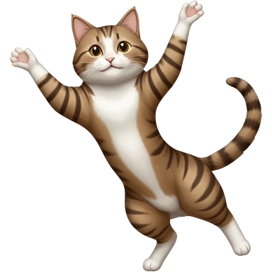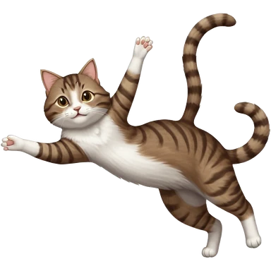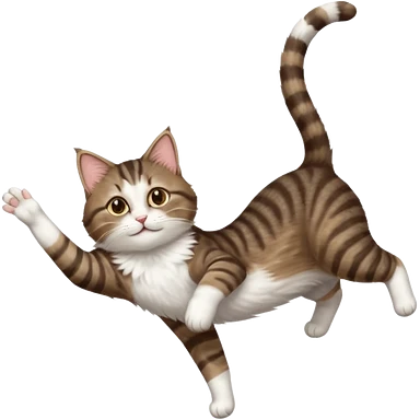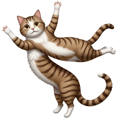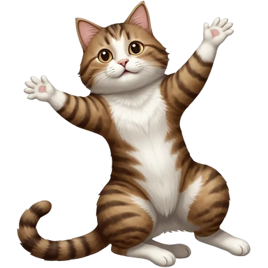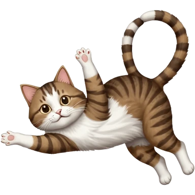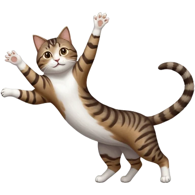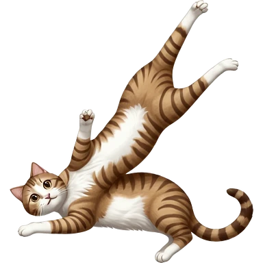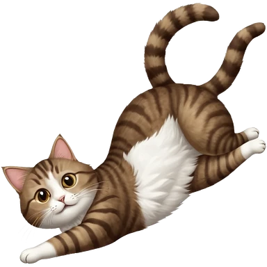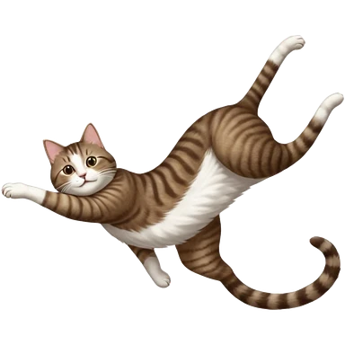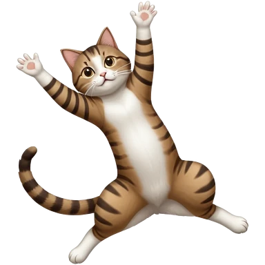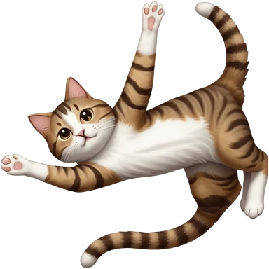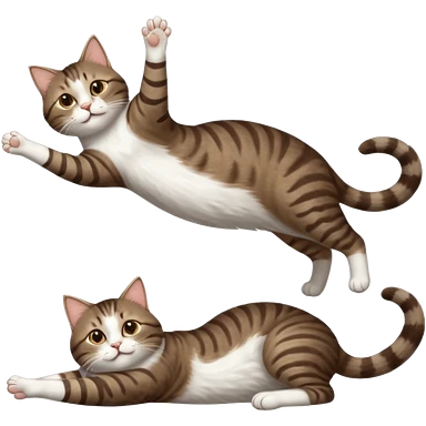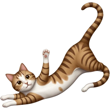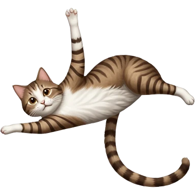 dark brown tabby and white cat with doing a big extremely long stretch reaching up into the air with arms and legs side by side together straight and overextended whilst lying on its side emoji