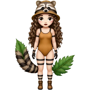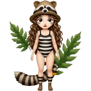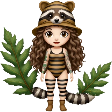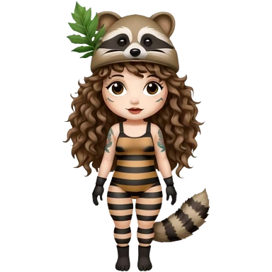 full body woman long curly brown hair brown eyes white skin tattoos wearing raccoon hat and striped leaf bodysuit emoji