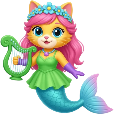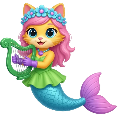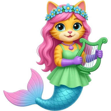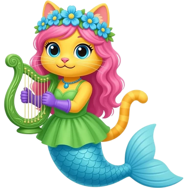yellow cat with pink hair blue flower crown with light purple shell necklace green dress attached to light blue mermaid tail with pink fins purple gloves holding a green harp artistic creation, beautiful art emoji
