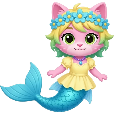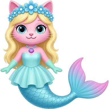 pink cat with light yellow hair blue flower crown with light purple shell necklace light cyan dress attached to long light cyan mermaid tail with pink fins light green gloves emoji