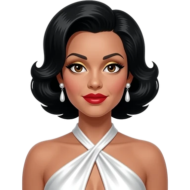 Eartha Kitt with dark brown eyes, black 50s bubble bob hair, gold eyeshadow, red lipstick, white metallic halter dress, earrings emoji