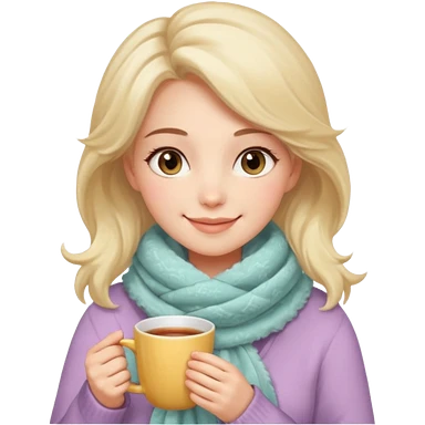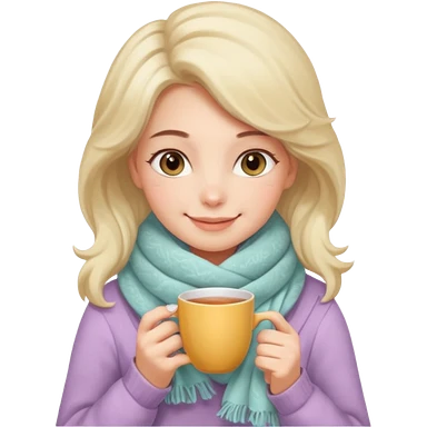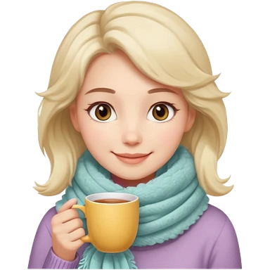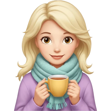 A warm-looking woman with a fluffy pastel scarf, smiling softly while holding a cup of tea. emoji