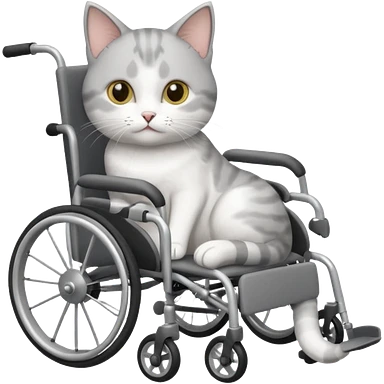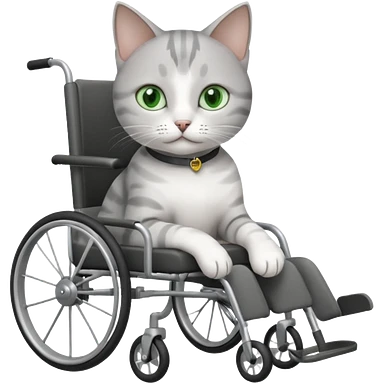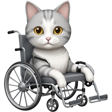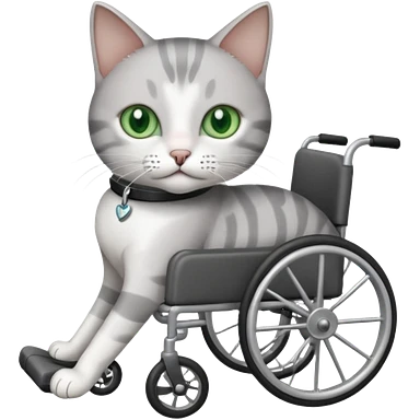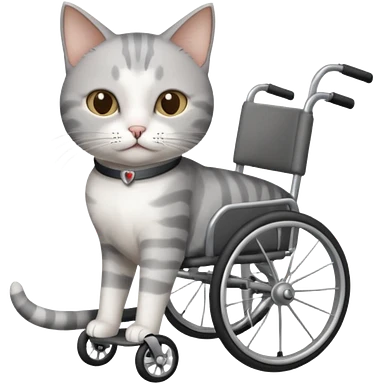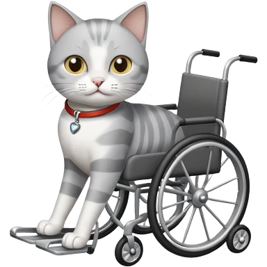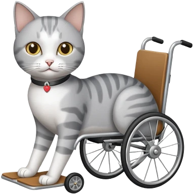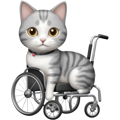 grey and white cat in a wheelchair designed for cats to walk emoji