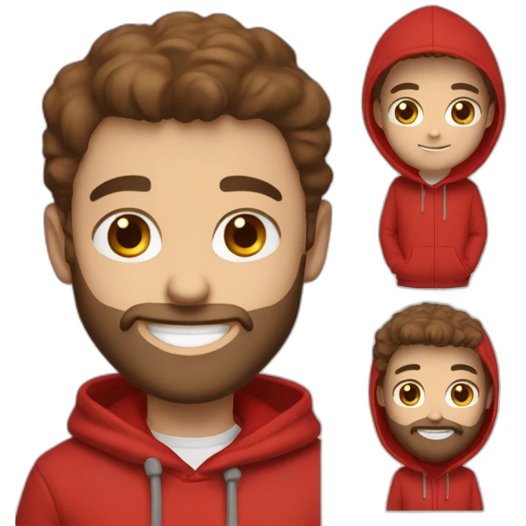 white dude smiling with a brown beard and short brown hair with a red hooded hoodie with "Posh" embroidered on the hoodie emoji | AI Emoji Generator