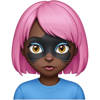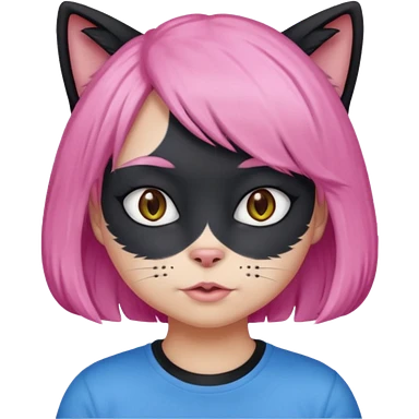 Black cat wearing a pink hair wig, blue T-shirt emoji