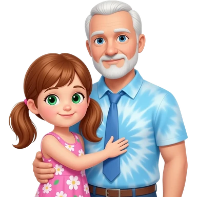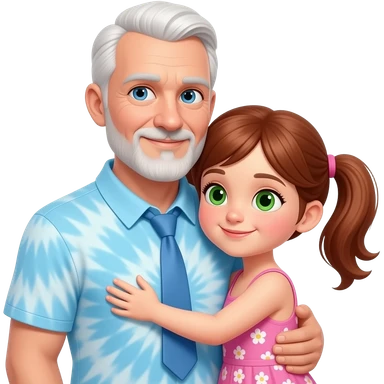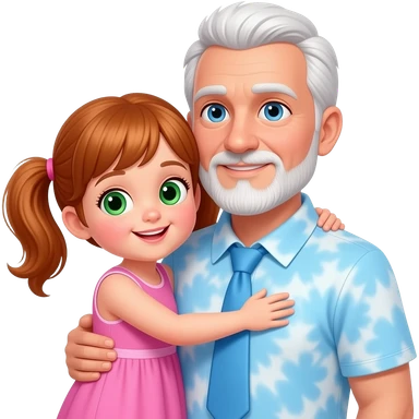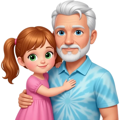 Dark Auburn haired girl child with light green hazel eyes twin ponytails wearing a pink floral sun dress hugging a light blue eyed adult father with side white fringe white hair eyebrows and white scruff style breard wearing a light blue tye dye polo shirt emoji