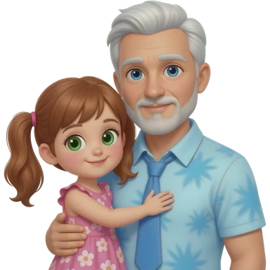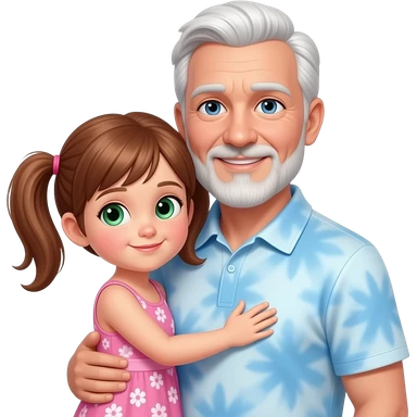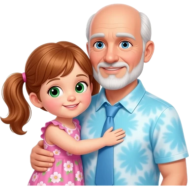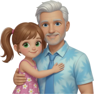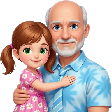 Dark Auburn haired girl child with light green hazel eyes twin ponytails wearing a pink floral sun dress hugging a light blue eyed adult balding father with side white fringe white hair eyebrows and white scruff style breard wearing a light blue tye dye polo shirt emoji