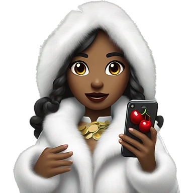A girl in a white fur coat with dark hair with an iPhone in her hands with stickers in the form of cherries and money emoji