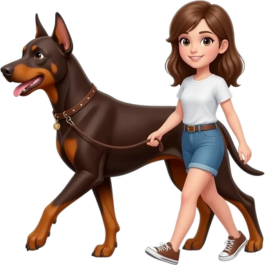 white girl with brown hair walking a brown dobberman dog on leash emoji