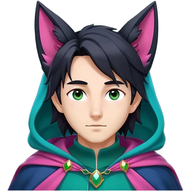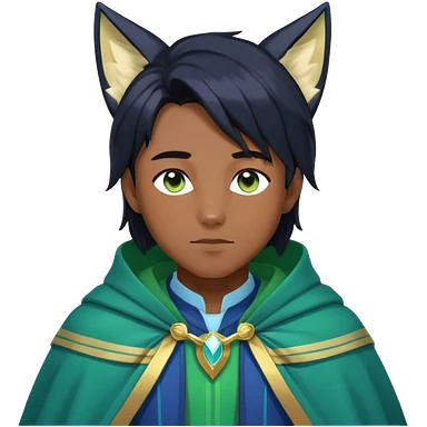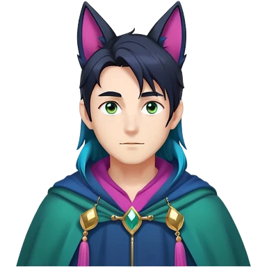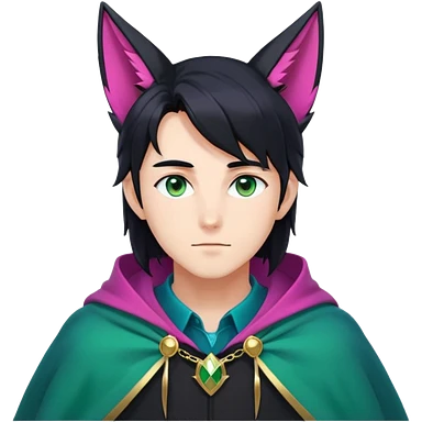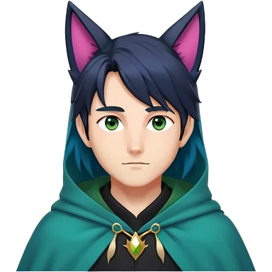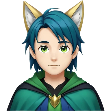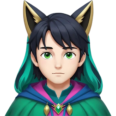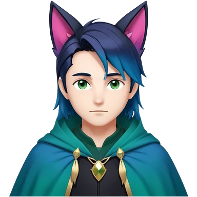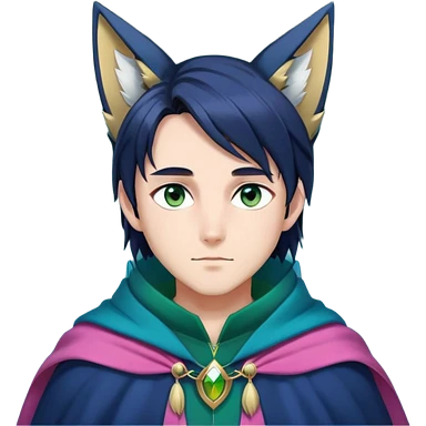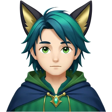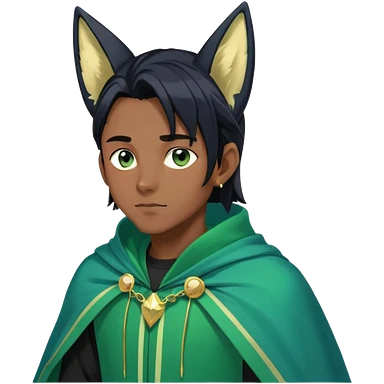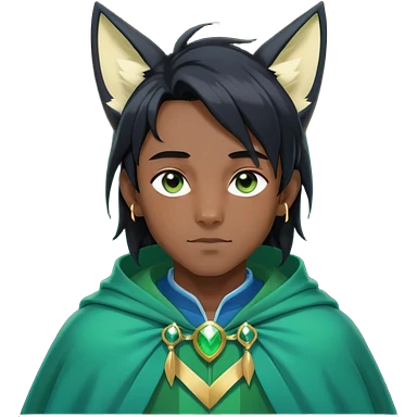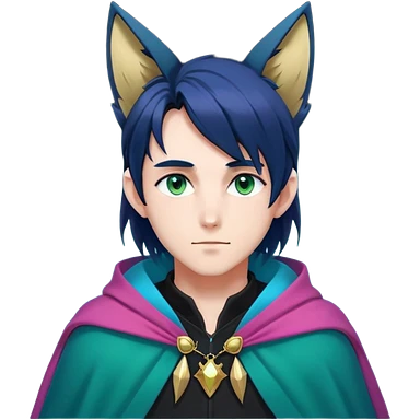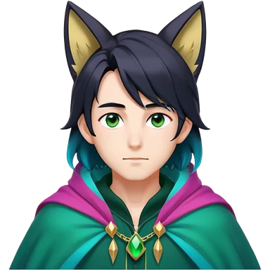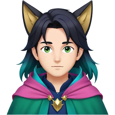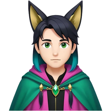 Black anime man with straight long black hair with light-green stripes in it, long dark-blue-black-gradient fox ears, hazel-gradient-brown-turquoise eyes, gold earring, dark-blue-sweater, green cape, emoji