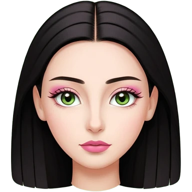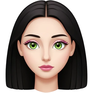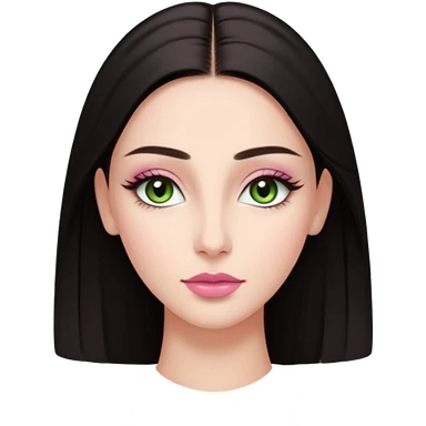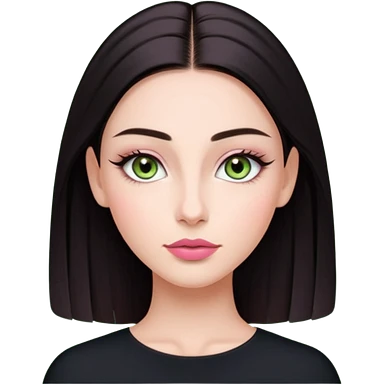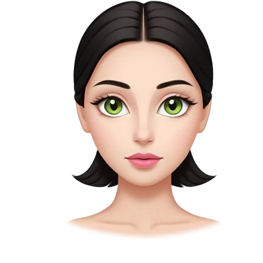 Front-facing portrait of a young woman with fair glowing skin, symmetrical features, light green almond-shaped eyes, long lashes, soft arched brows, straight refined nose, and full natural pink lips. Dark sleek hair pulled back with a middle part. emoji