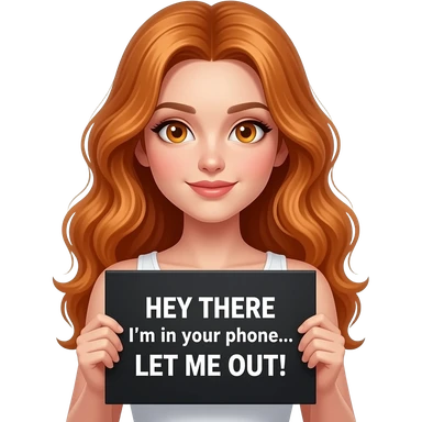 sexy girl with long wavy ginger hair and ginger eyes wearing a white tanktop is holding a black colored sign with HEY THERE I'm in your phone... LET ME OUT! written on it emoji